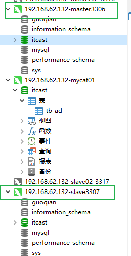 这回再连接你的master01和slave01,都同时多出来了一个itcast数据库,一张和mycat中tb_ad内容一致的表