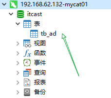 连接成功后长这个德行,注意itcast库和tb_ad表是根据你的xml文件中配置规则自动生成的,但是此时tb_ad是个逻辑空表,暂时不能用,如果你没有生成itcast数据库,可以在3360master01中新建一个itcast数据库,重启mycat进行测试