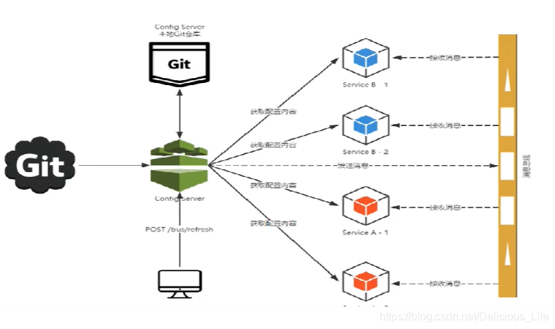 bus 通过轻量消息代理连接各个分布的节点。其本质是利用MQ的广播机制在分布式的系统中传播消息,可以通过Kafka或RabbitMQ来使用。bus在工作原理如下