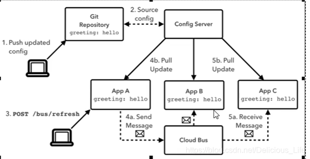 图一表示bus请求推送到配置中心后,配置中心把配置文件的改变推送给serviceABC。图二表示消息被推送到serviceA后,A再把配置文件改变这件事推送给B和C。仔细想想,第二种方式并不好,因为如果A挂了B和C就不知道配置文件改变了