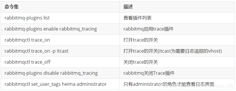 消息追踪就好比记录消息的log日志,使用Trace实现。需要在rabbitmq客户端启动插件并设置一系列参数:rabbitmq-plugins enable rabbitmq_tracing