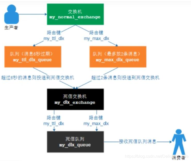 如果同时使用上述两种方法,则消息过期时间以两者之间的TTL较小数值为准。消息在队列的生存时间一旦超过了TTL值,就称为dead message并被投递到死信队列,消费者将无法再收到该消息