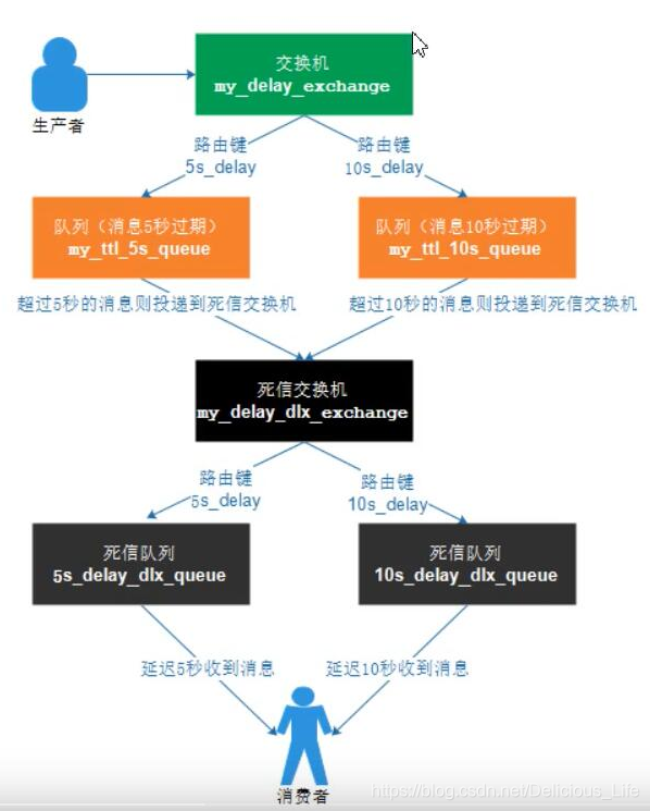 延迟队列存储的对象是对应的延迟消息,即消费者发送到消息队列后,等待指定时间后消费者才能拿到这个消息进行消费。延迟队列可以通过设置过期时间+死信队列来实现,流程如下