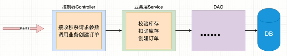 请求进来后先走Controller,在Service层依次校验库存、扣除库存、创建订单。最新持久化到DB中