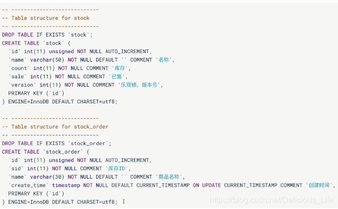有两张表,一张订单表,一张库存表。库存表中的count字段代表“一开始一共有多少库存”、sale字段代表“已售了多少” 、version用来记录“乐观锁的版本号”