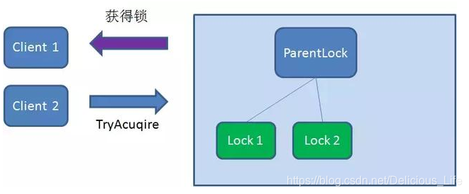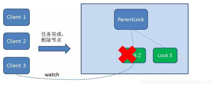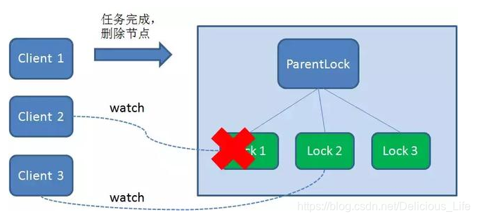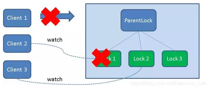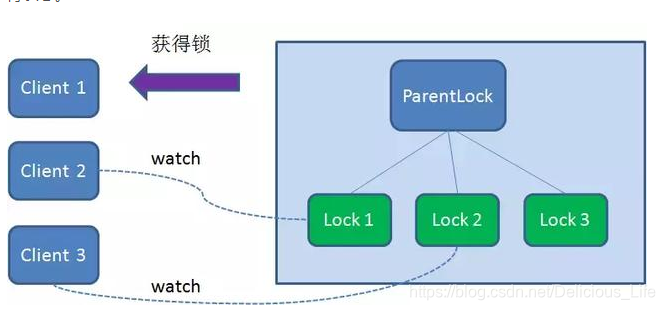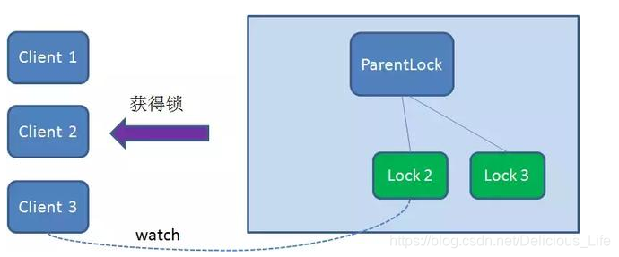 这样一来Clinet1得到锁、Clinet2监听Lock1、Client3监听Lock2,类似于一个等待队列。