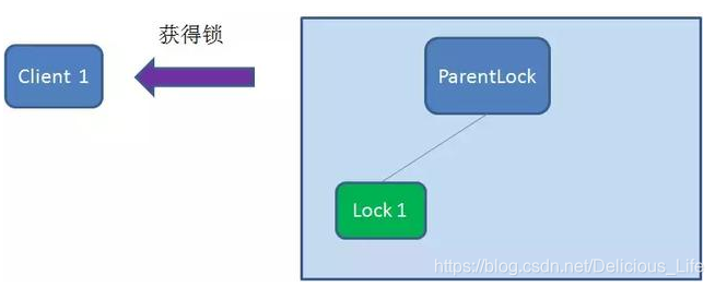 Client1查找ParentLock下面所有临时顺序节点并排序,判断自己创建的节点Lock1是不是顺序最靠前的一个,如果是则成功获取锁