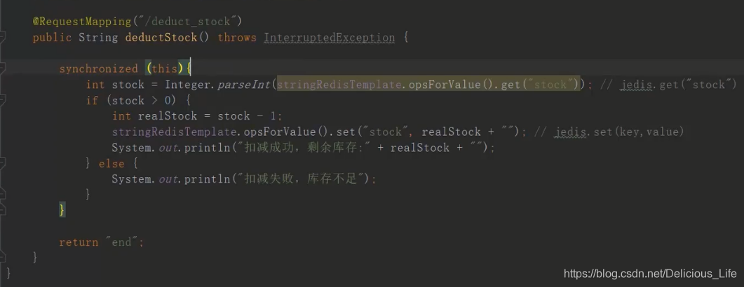 我们来看一个秒杀小案例,每有一个用户下单库存就-1 ,在单环境部署情况下,我们添加了synchronized锁,锁住扣除库存代码块,这样不会出现多线程并发导致库存数量出现重复或负数问题。