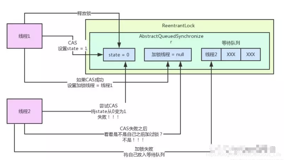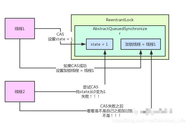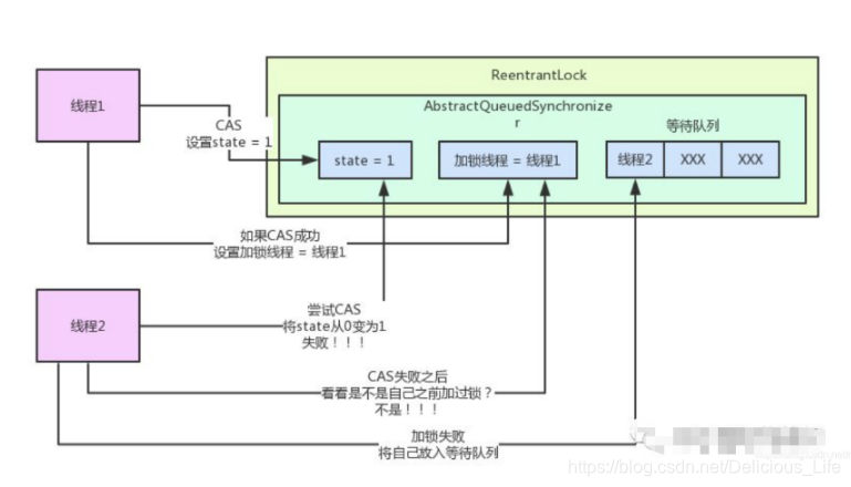 接着上段,当线程2跑过来后发现state的值不是0,所以CAS操作将state从0变1的过程会失败。接着线程2会看一下是不是自己之前加锁了?当然不是,“加锁线程变量”会标明是哪个线程占用了锁,所以线程2的可重入操作也失败。