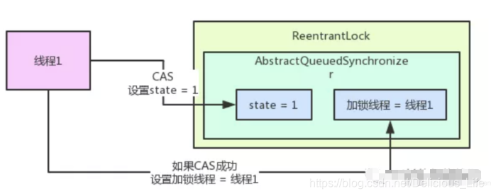 当加锁时,线程1跑过来调用ReentrantLock方法尝试加锁,这个加锁的过程,用的是CAS操作将state的值从0变成1。如果之前没人加过锁,那么state的值肯定是0,此时线程1就可以加锁成功。