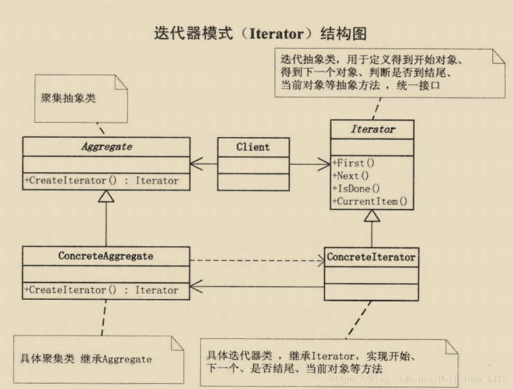 聚集抽象类(Aggregate)是具体聚集类的父类(ConcreteAggregate)。迭代抽象类(Iterator)是具体迭代器类(ConcreteIterator)的父类。聚集抽象类和迭代抽象类都和客户端是关联关系。具体迭代器类和具体聚集类之间有依赖关系和关联关系,具体聚集类依赖于具体迭代器类;具体迭代器类和具体聚集类有关。