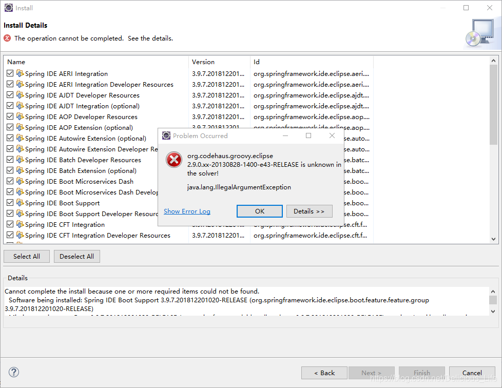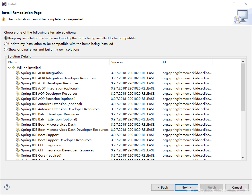 这里报错提示的是你少一个插件,你可以根据下面的链接下载。这个文件也是zip格式的,安装方法和spring前几步一样,它也会出现类似上图我勾选4个IDE文件那个界面。因为我当时不懂这个插件是干嘛的,所以我把能选的4个都选上然后安装了。这个安装应该没什么问题,安装好插件之后记得要重启你的eclipse!!!