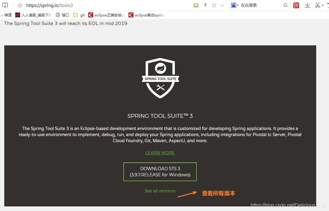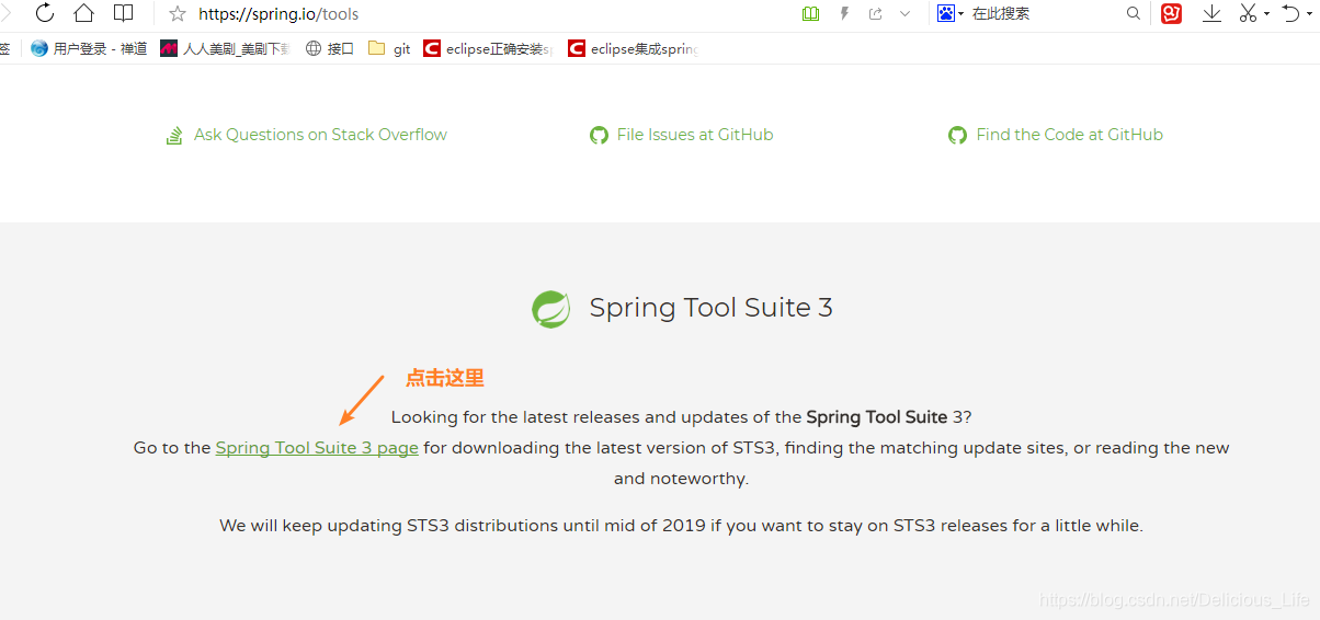 进去之后拉到最下面,找到绿色链接spring tool suite 3 page,点进去
