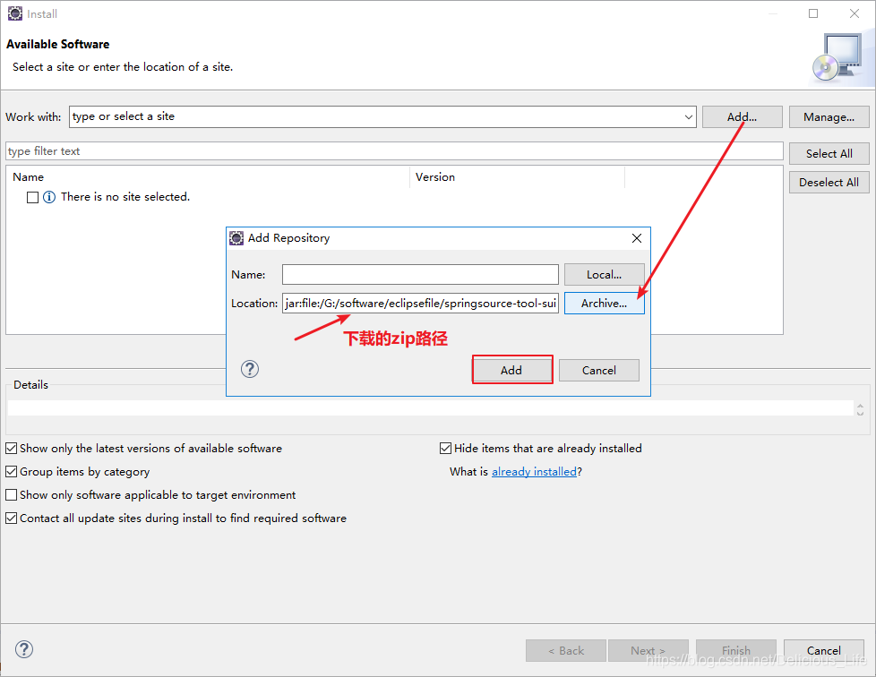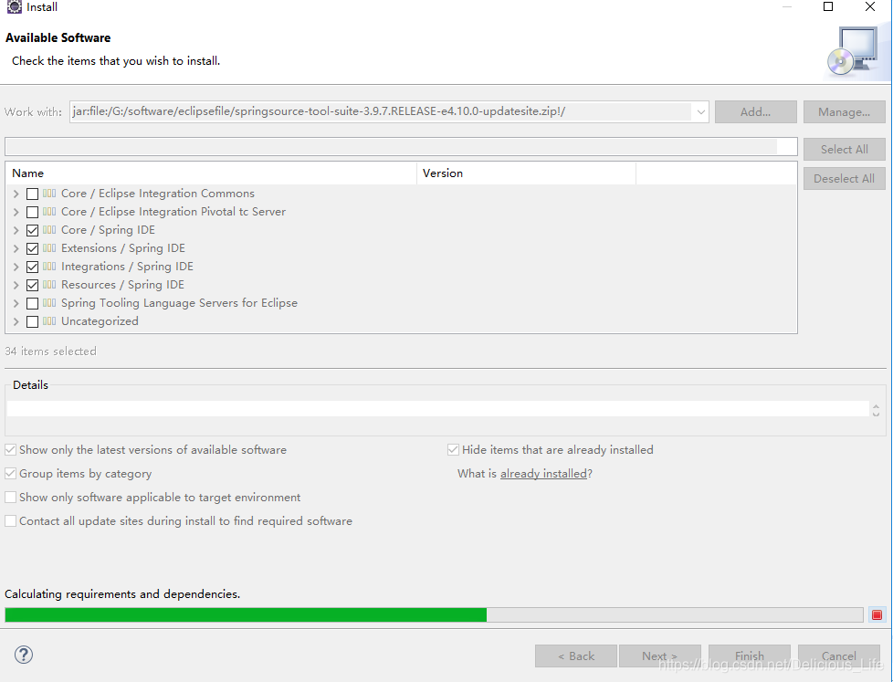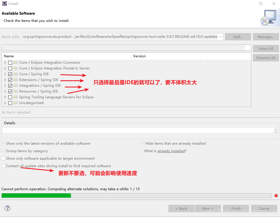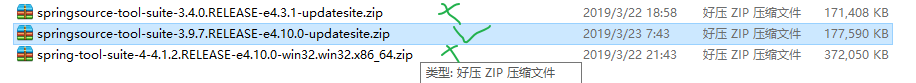 上图是我亲测的三个spring包,只有中间的是正确的。为什么?第一个安装失败是因为我的elipse是4.10.0,第一个的版本是4.3.1版本不兼容。第三个安装失败是因为这个包必须是有updatesite的,虽然第三个压缩包和我的eclipse版本一致,但是没有这个也不行!!!