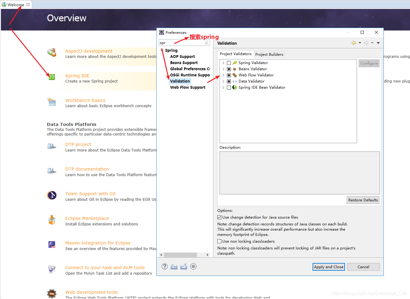 2.点击windows——Preferences——搜索spring,在Validation这里你会看见spring的插件