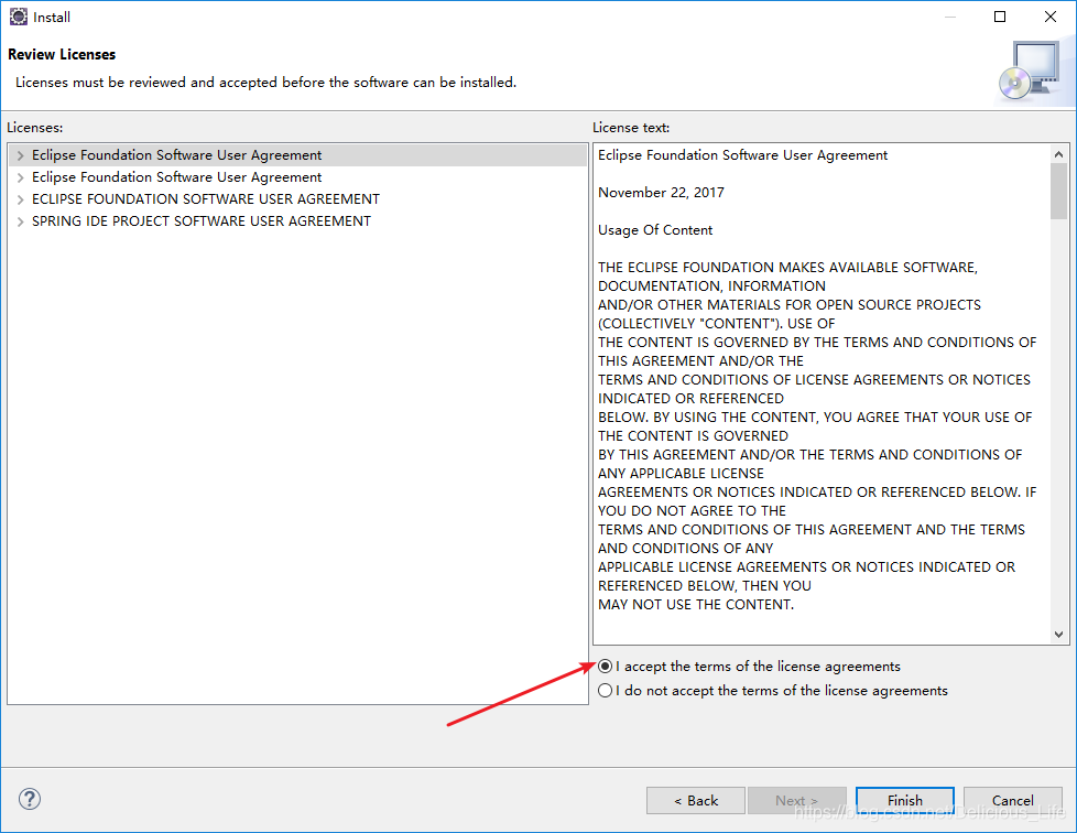 千万不要关闭eclipse,上面你点击finish之后,eclipse的右下角会出现电池一样的图标,这个图标其实是ecilpse在自动安装spring,那个进度条走到100%之后自动弹出一个窗口,问你是否重启eclipse。当然重启,重启后才生效。