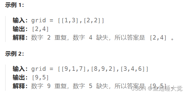 给你一个下标从 0 开始的二维整数矩阵 grid,大小为 n * n ,其中的值在 [1, n²] 范围内。除了 a 出现两次,b 缺失 之外,每个整数都恰好出现一次 。