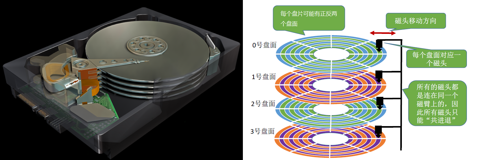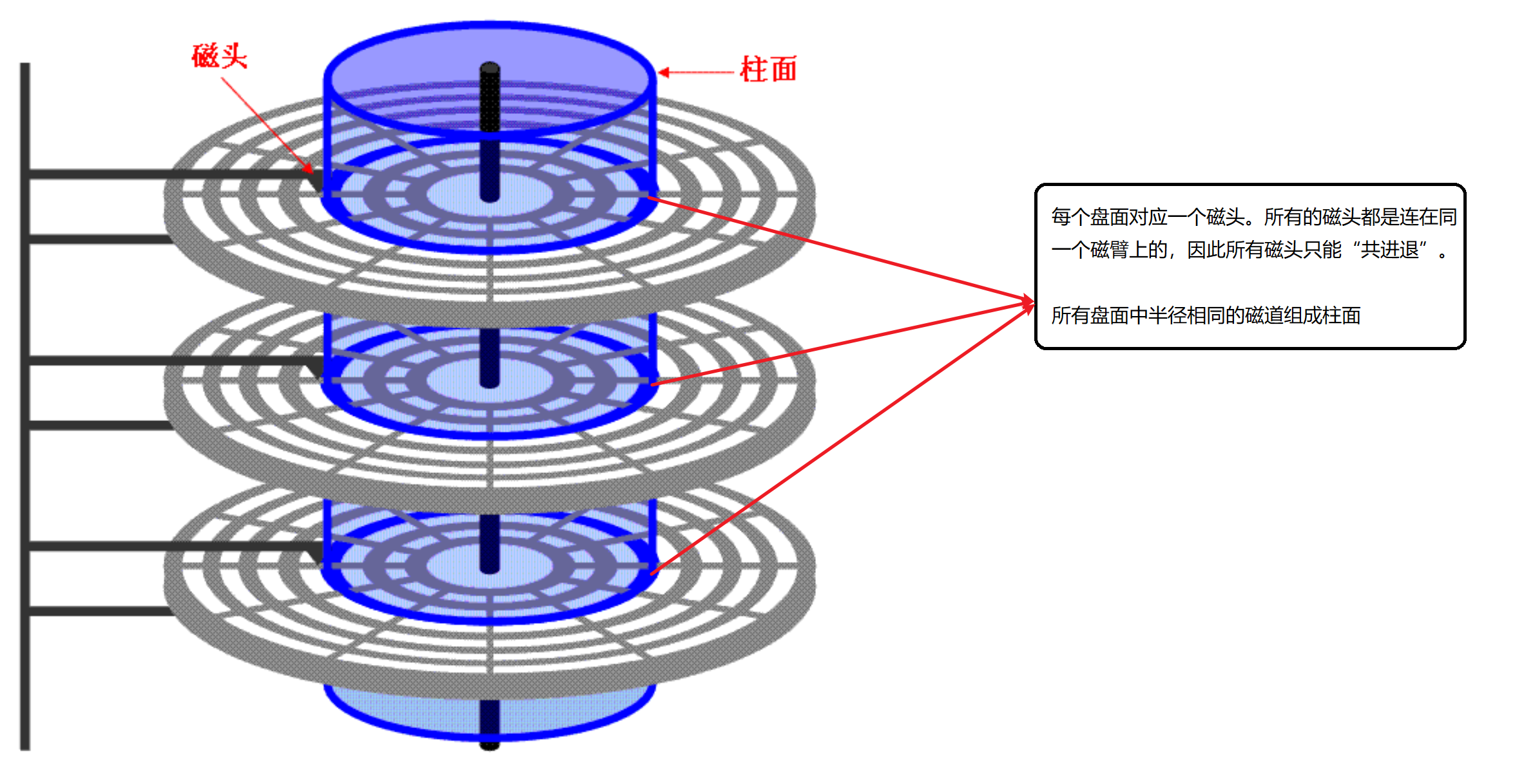 ① 根据“柱面号”前后移动磁臂,让磁头指向指定柱面;