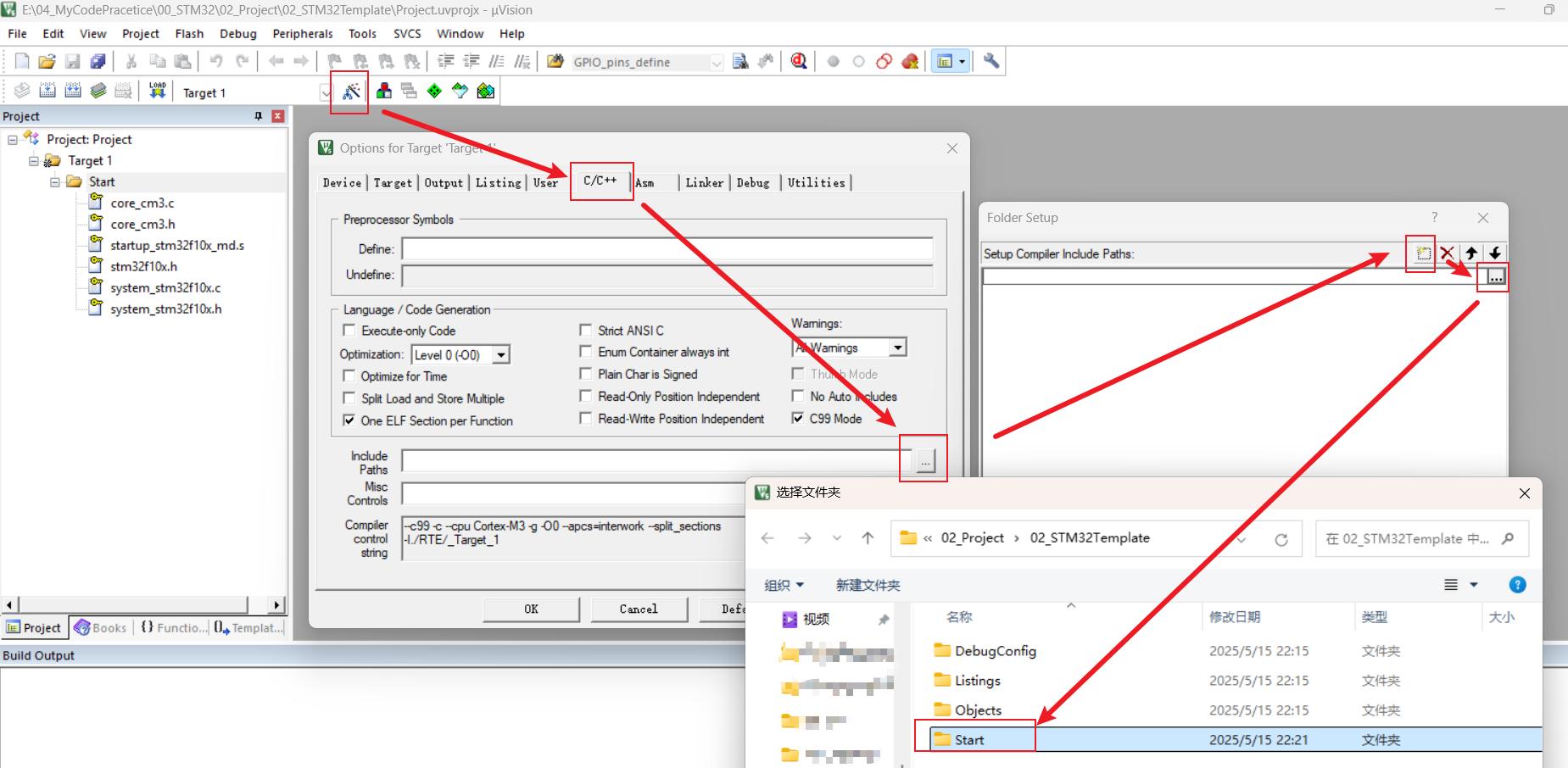 获取STM32固件库——打开Keil新建工程——在新建工程文件夹路径下新建Start文件夹——将Start文件夹加入group——将Start文件夹中头文件加入到可搜索路径中——新建User文件夹