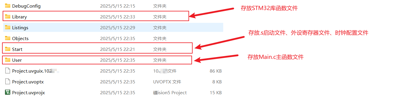 其中,文件夹Library、Start、User为新建文件夹,分别存放内容如图中注释。除此外的文件均为新建工程后自动生成的内容。