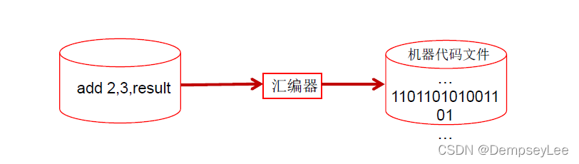 - 汇编语言。使用助记符表示一条机器指令。