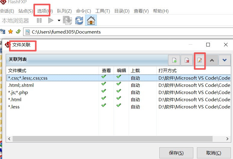 如果是FlashFXP,工具里面没有选项,那么就点击工具栏上面的选项,然后找到文件关联,然后修改打开方式就可以啦!