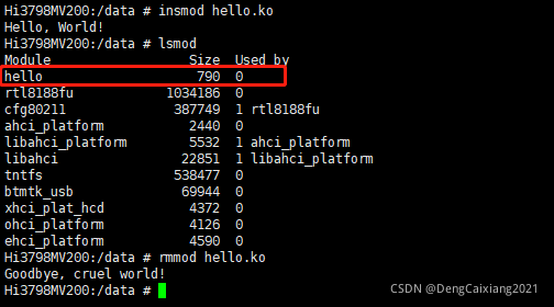 可通过insmod将模块加载到正在运行的内核中,lsmod可以查看模块,rmmod可以卸载模块,运行结果如下: