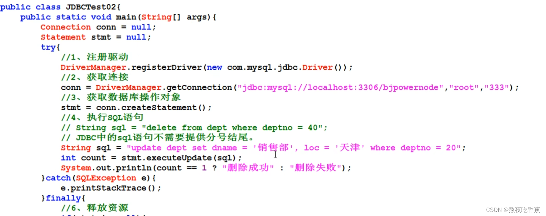 第六步:释放资源(使用完资源之后一定要关闭资源。Java和数据库属于进程间的通信,开启之后一定要关闭。)