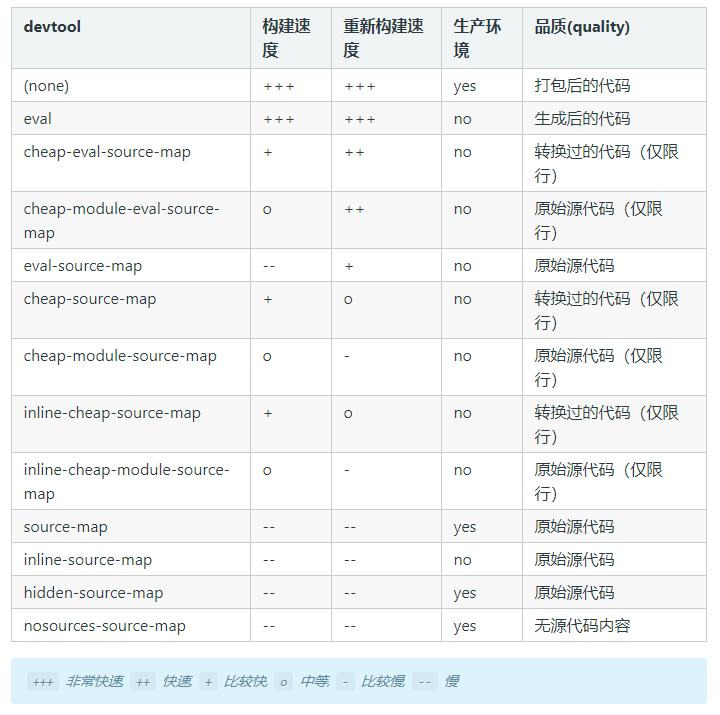 webpack为我们提供了多种 source map ,选择一种 source map 格式来增强调试过程。不同的值会明显影响到构建(build)和重新构建(rebuild)的速度。具体对比如下表:
