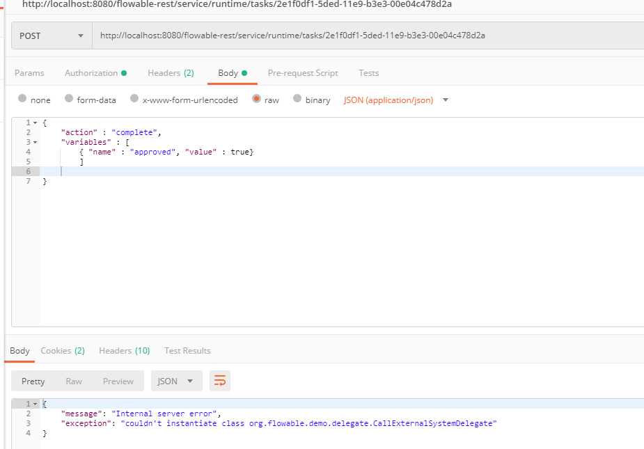 curl --user rest-admin:test -H "Content-Type: application/json" -X POST -d '{ "action" : "complete", "variables" : [ { "name" : "approved", "value" : true} ] }' http://localhost:8080/flowable-rest/service/runtime/tasks/25