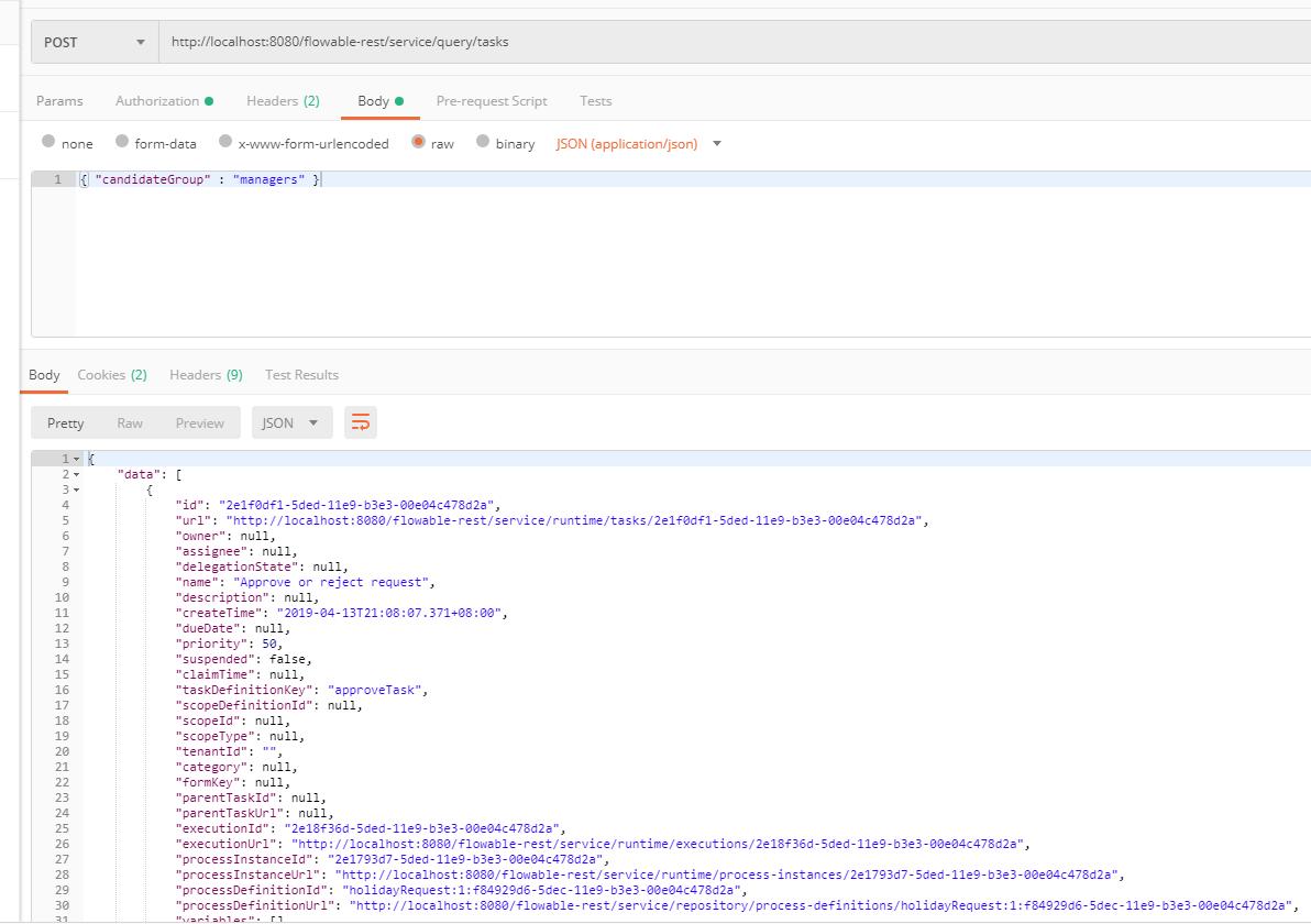 curl --user rest-admin:test -H "Content-Type: application/json" -X POST -d '{ "candidateGroup" : "managers" }' http://localhost:8080/flowable-rest/service/query/tasks