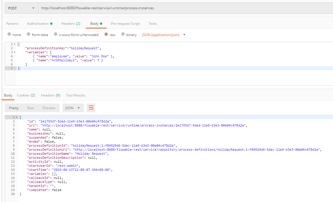 curl --user rest-admin:test -H "Content-Type: application/json" -X POST -d '{ "processDefinitionKey":"holidayRequest", "variables": [ { "name":"employee", "value": "John Doe" }, { "name":"nrOfHolidays", "value": 7 }]}' http://localhost:8080/flowable-rest/service/runtime/process-instances