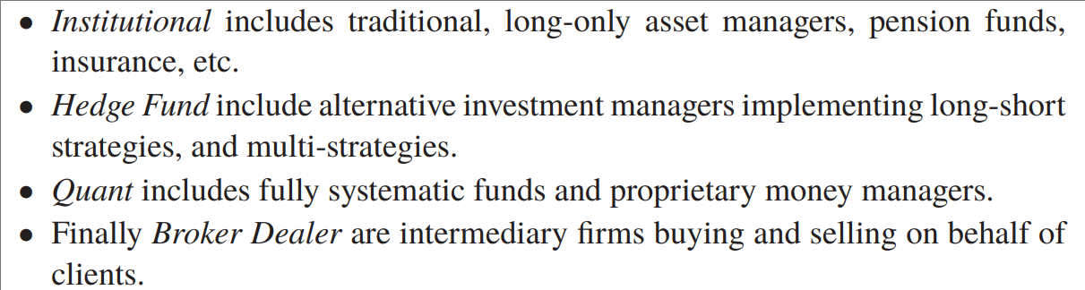 机构投资者/Institutional;对冲基金/Hedge Fund;量化基金/Quant;经纪交易商/Broker Dealer。