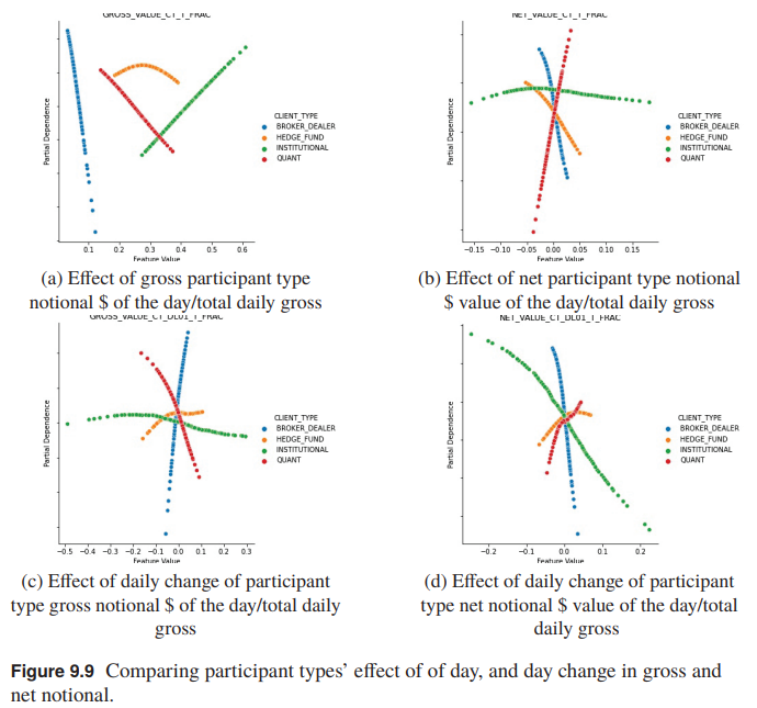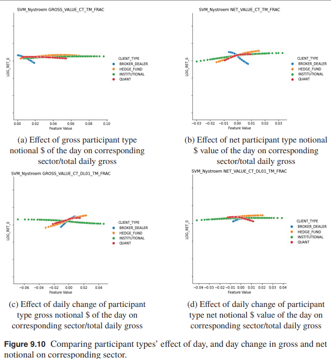与上图进行对比,可以得到结论:量化净流与对冲基金及机构净流之间存在对抗性影响(图9.9),但协同影响方向相同(图9.10),且影响程度并无太大差异。