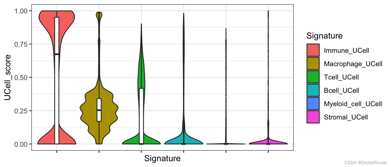 p <- ggplot(melted, aes(x = Signature, y = UCell_score)) + geom_violin(aes(fill = Signature),