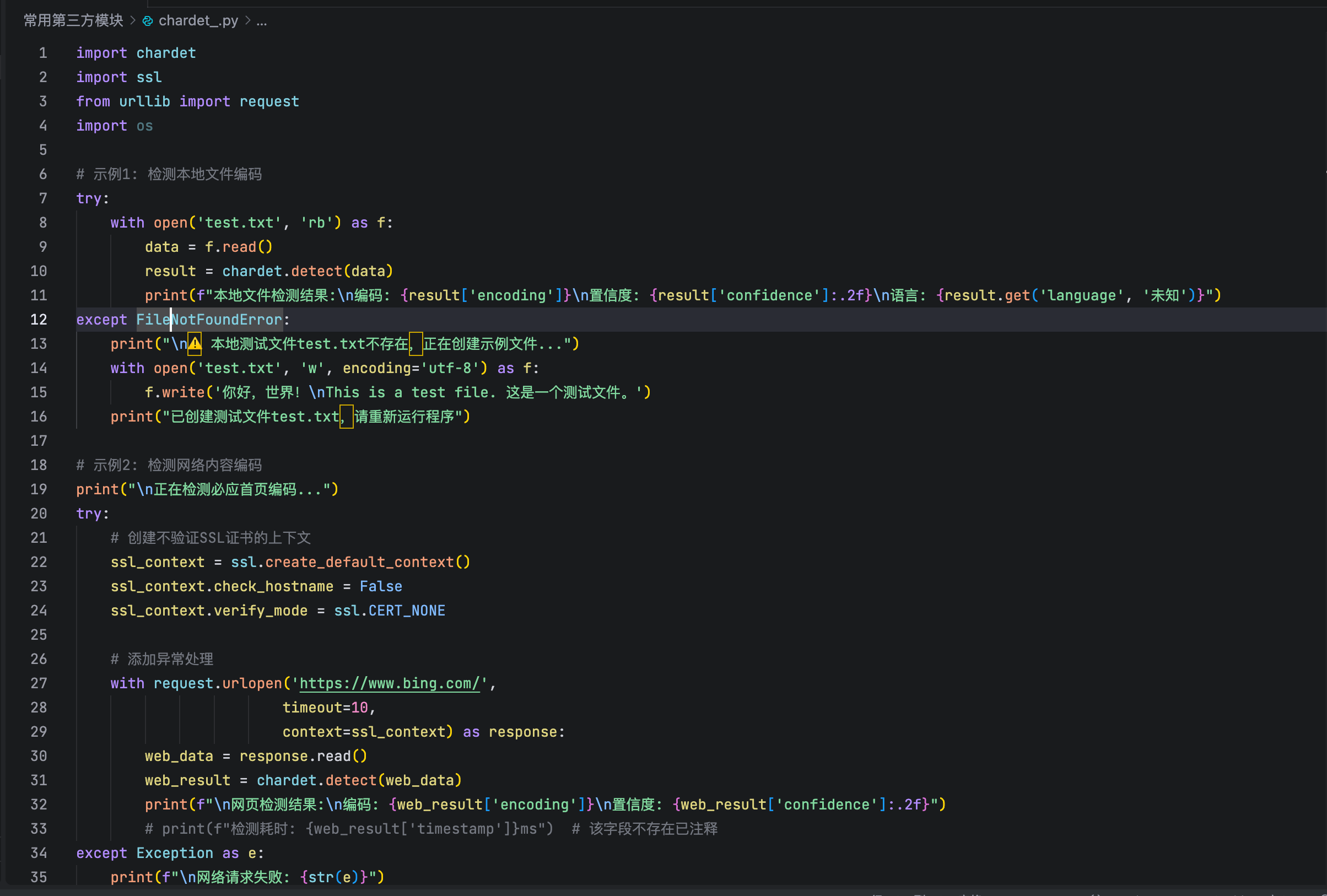 当然,我们肯定不能从头自己写这个检测编码的功能,这样做费时费力。chardet这个第三方库正好就派上了用场。用它来检测编码,简单易用。