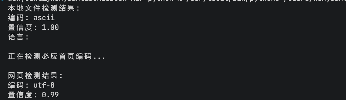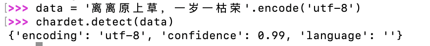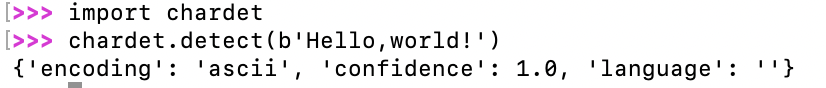检测出的编码是ascii,注意到还有个confidence字段,表示检测的概率是1.0(即100%)。