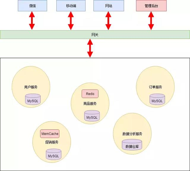 完全拆分后各个服务可以采用异构的技术。比如数据分析服务可以使用数据仓库作为持久化层,以便于高效地做一些统计计算;商品服务和促销服务访问频率比较大,因此加入了缓存机制等。