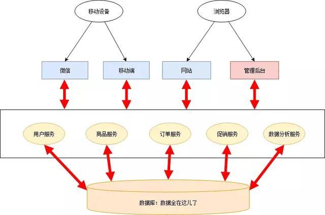 因为开发任务比较紧迫,小明小红没有好好规划整个系统的架构,随便拍了拍脑袋,决定把促销管理和数据分析放在管理后台里,微信和移动端APP另外搭建。通宵了几天后,新功能和新应用基本完工。这时架构图如下: