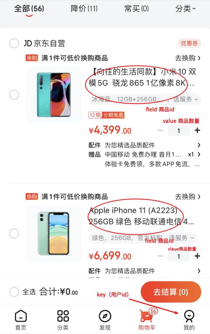 如果将商品id和商品数量序列化成json字符串,那么也可以用上面讲的string类型存储。下面对比一下这两种数据结构:
