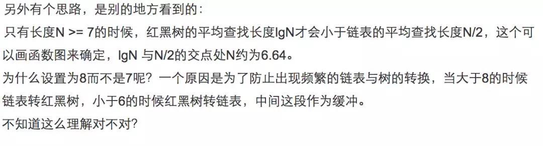 jdk作者选择8,一定经过了严格的运算,觉得在长度为8的时候,与其保证链表结构的查找开销,不如转换为红黑树,改为维持其平衡开销。