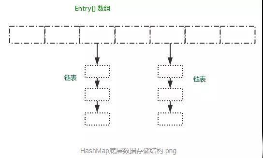 HashMap采用Entry数组来存储key-value对,每一个键值对组成了一个Entry实体,Entry类实际上是一个单向的链表结构,它具有Next指针,可以连接下一个Entry实体。