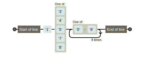 - [34578]:字符集合,匹配3、4、5、7、8其中一位