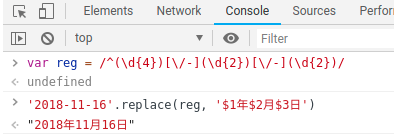 将公式调整一下,变成/^(\d{4})[\/-](\d{2})[\/-](\d{2})/,即可以将括号中的变量直接保留用于做字符串替换效果: