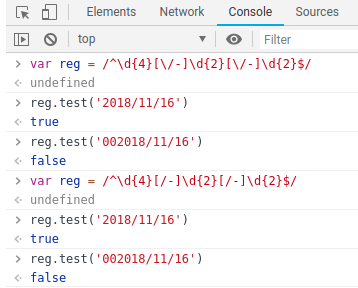 注意:由于PHP中斜杠(/)需要转义才能匹配,如果是JS中,正则表达式/^\d{4}[/-]\d{2}[/-]\d{2}$/即可,当然/^\d{4}[\/-]\d{2}[\/-]\d{2}$/这个也是可以使用的。