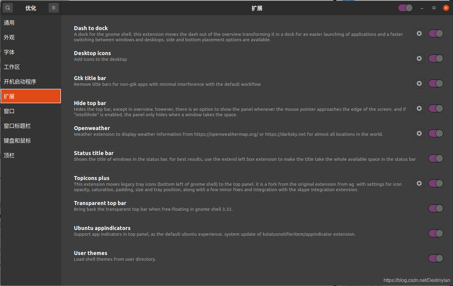 在gnome插件商城中安装Gtk title bar和Hide top bar