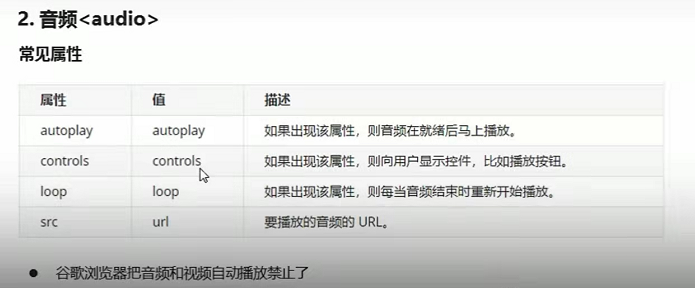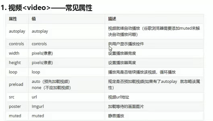 - 视频标签是重点,我们经常设置自动播放,不使用controls控件,循环和设置大小属性