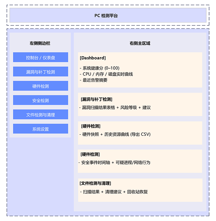 本工具的核心功能是把复杂的系统维护工作自动化、可视化并且可操作化:它会优先扫描并核验本机的已知漏洞与补丁状态(如需对局域网内其他主机扫描,仅在获得明确授权后进行),实时采集并以历史曲线展示 CPU、内存与磁盘等硬件指标,监测可疑系统行为(例如异常网络连接、进程激增或异常的文件活动)并支持将相关证据打包导出,另外还可扫描并清理临时文件、浏览器缓存和体积较大的文件,清理时默认走回收站以便恢复。这样一来,用户能通过一句话的结论加上几张图表,快速了解电脑的健康与安全态势,并据此采取后续行动。