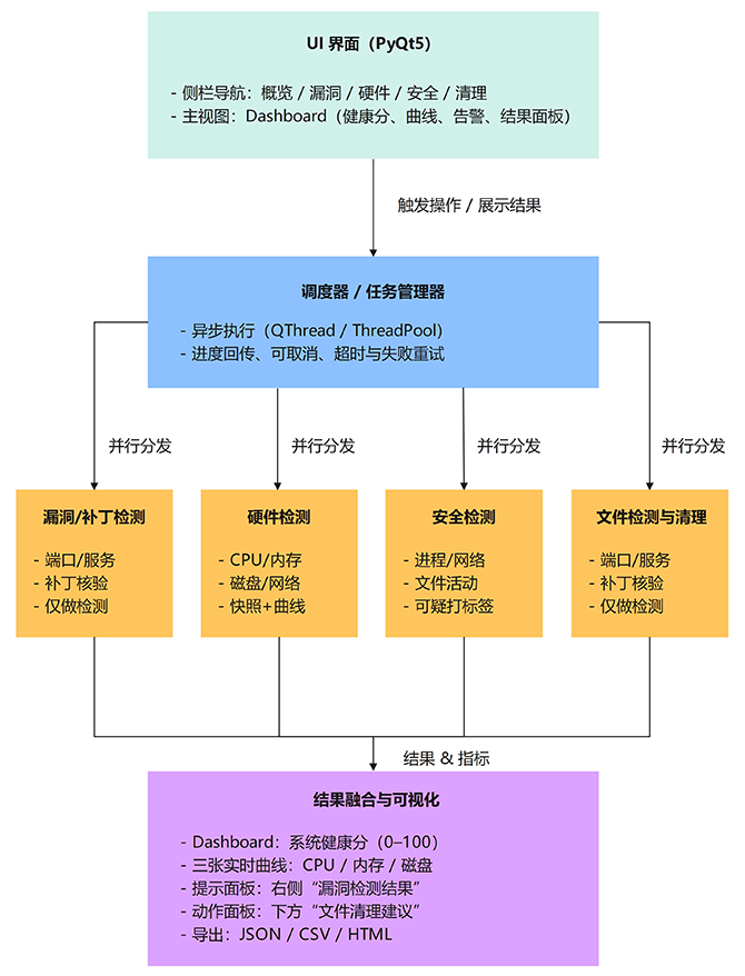整个平台由 UI(PyQt5)+ 调度器 + 五大检测模块 + 日志/报告 构成,层次清晰、各司其职。UI 使用 PyQt5 搭建成“侧栏导航 + Dashboard(健康总览)”的结构:侧栏切换模块,Dashboard 汇聚核心指标与告警。调度器负责把所有耗时操作丢到后台(QThread / 线程池),在不阻塞界面的前提下持续回传进度与结果,让交互始终顺滑。