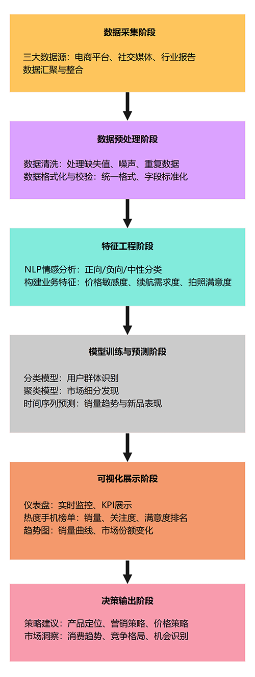 接下来,数据会进入处理与特征工程阶段。我们清理掉噪声和冗余信息,并通过自然语言处理(NLP)技术对评论进行情感分析,识别其中的正向、负向与中性情绪。同时,我们还构建了关键特征,如价格敏感度、续航需求度和拍照满意度,为后续建模提供坚实支撑。